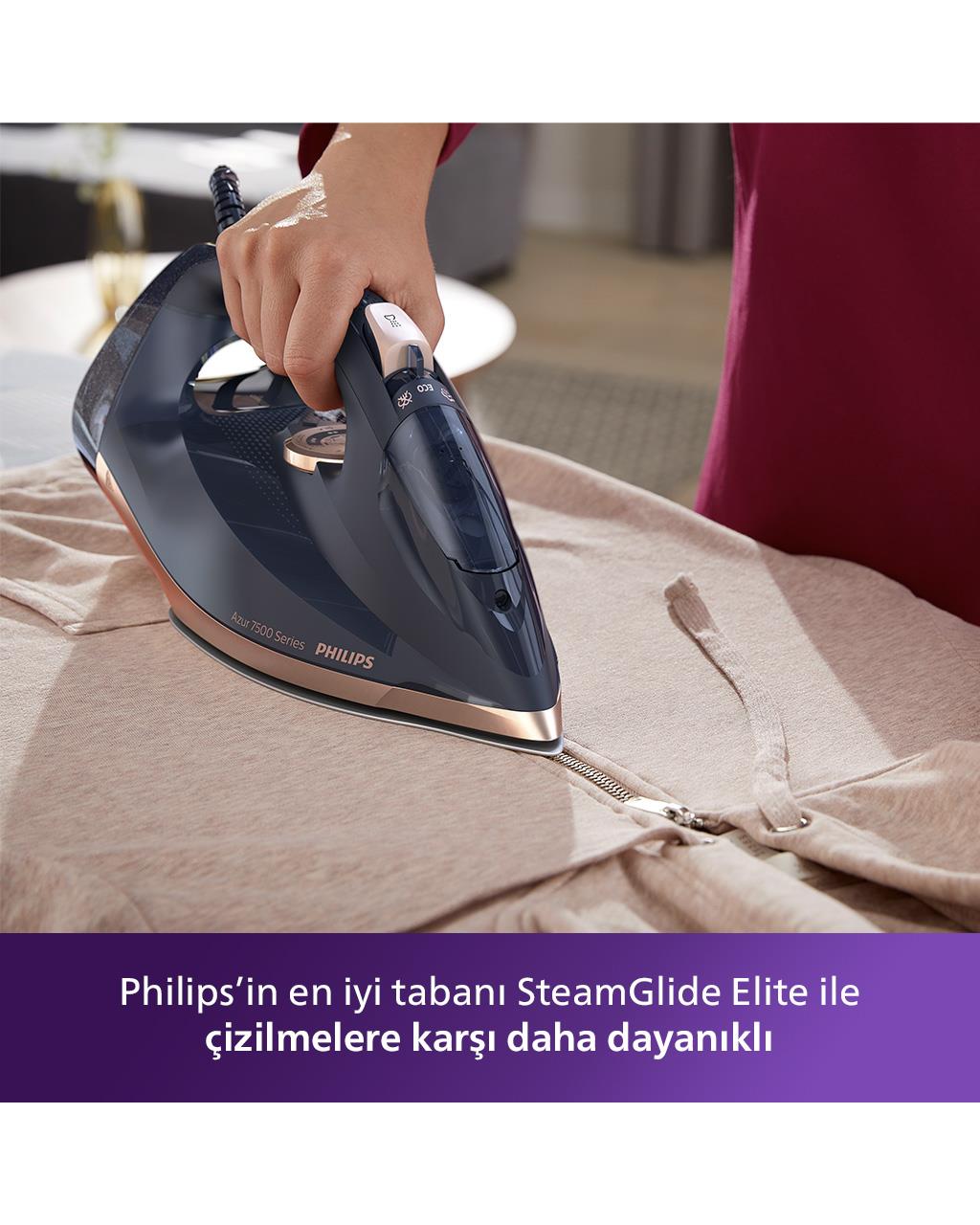 Philips 5000 Serisi BUH Ütü DST5030/80, SteamGlide Elite tabanı sayesinde tüm kumaşlarda kolayca kayar ve çizilmeye karşı dayanıklıdır. Damlama önleyici sistemi giysilerin lekesiz kalmasını sağlarken, 300 ml su haznesi daha uzun ütüleme seansları için pratik kullanım sunar.